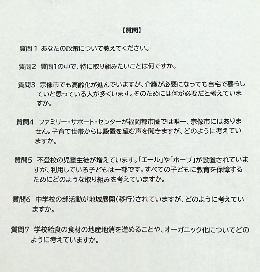 市長選に立候補を表明されている方に、ふくおか市民政治ネットワーク・宗像として、公開質問状を渡しました。